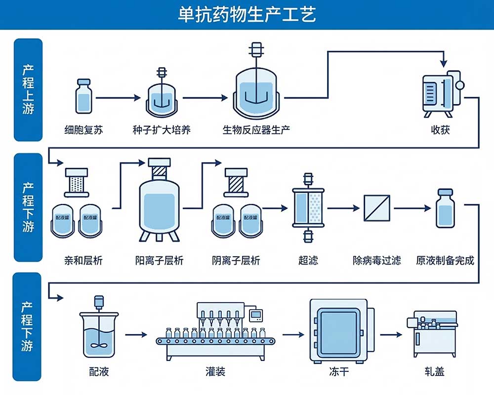 单克隆抗体作为现代生物制药的核心品类,广泛应用于肿瘤、自身免疫性疾病等领域。其生产工艺复杂且高度标准化,涵盖细胞培养、收获、蛋白A层析、病毒灭活、离子交换、超滤透析、制剂配制、无菌灌装等关键步骤。每一环节的流体输送与控制,直接影响单抗的活性、纯度、稳定性与批间一致性。面对日益严格的GMP、FDA、EMA等法规要求与降本增效的行业趋势,普瑞流体如何以智慧化、低剪切、高精度的流体解决方案,赋能单抗生产的全流程可控与规模化放大?